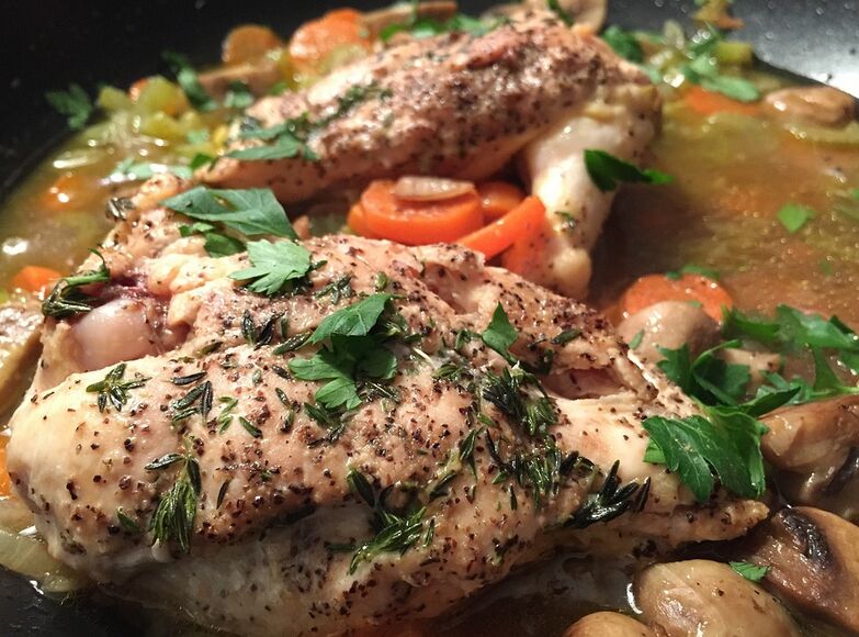 Coq au Vin je tradiční francouzský pokrm, původně připravovaný z kohouta dušeného na červeném víně s kořenovou zeleninou, slaninou a bylinkami.