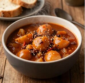 Erdäpfelgulasch je tradiční rakouské jídlo z brambor, které se vyznačuje jednoduchostí, výraznou chutí cibule a sladké papriky.