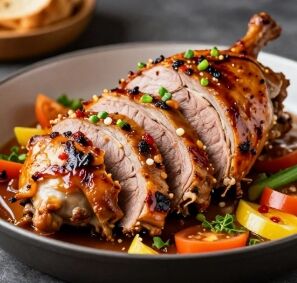 7. Maso nakrájejte na plátky a podávejte přelité omáčkou.