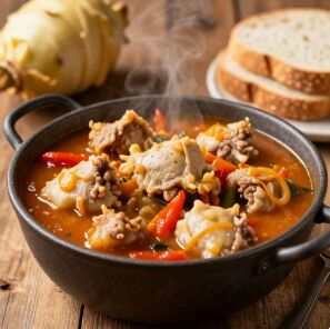 - Zalijte vodou nebo vývarem tak, aby byly suroviny lehce ponořené, a vše promíchejte.