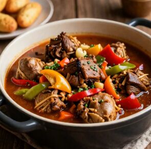 Podávejte s rýží, vařenými bramborami nebo houskovým knedlíkem. Jídlo chutná nejlépe odleželé, druhý den je ještě výraznější.